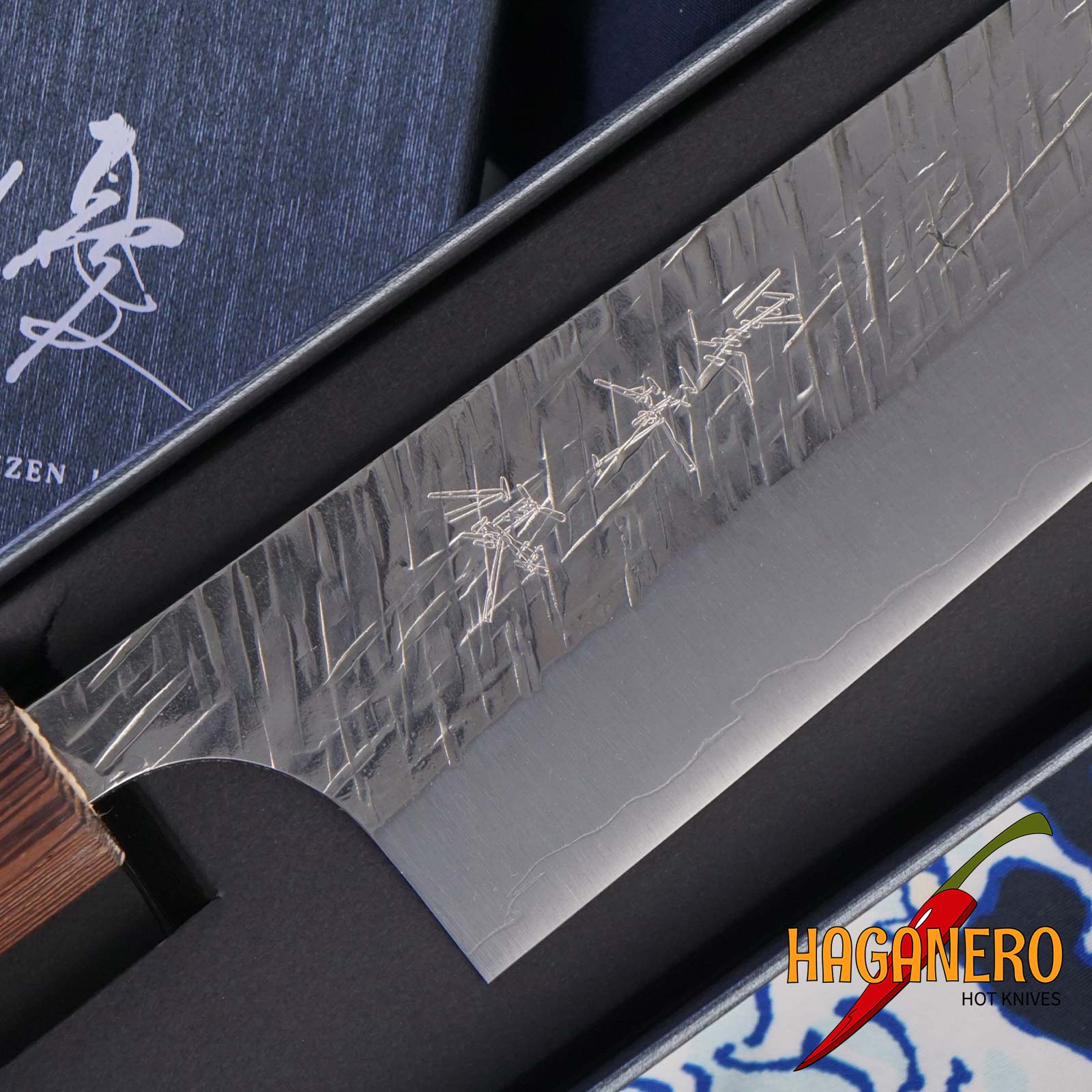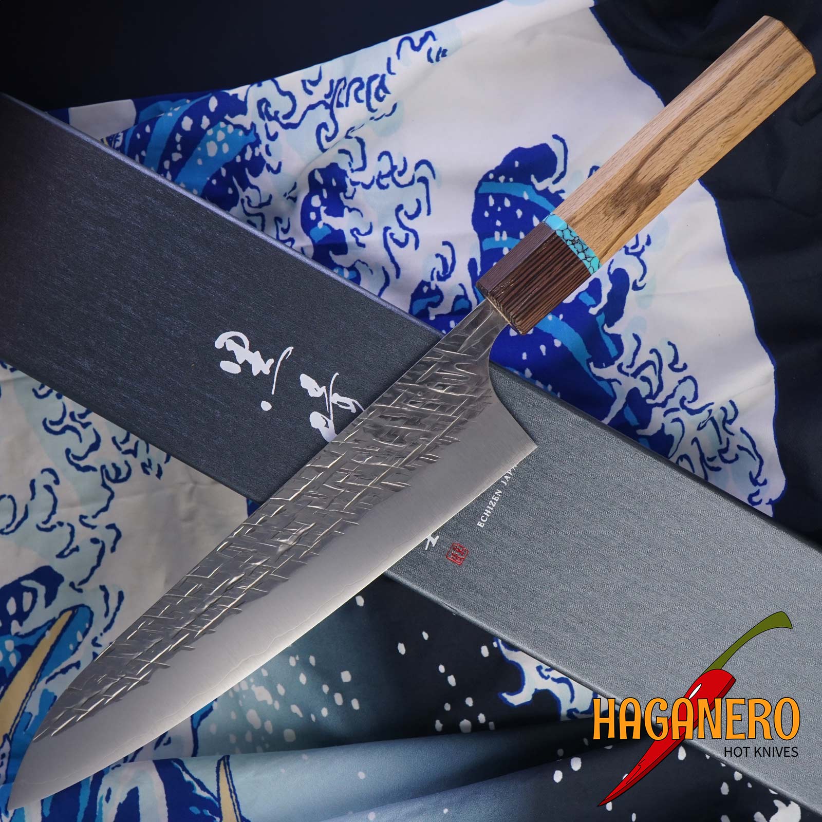 Raijin Gyuto Zapomeňte na ručně vyráběný nůž z japonské speciální série Cobalt od řemeslníka Yu Kurosakiho. Čepel má délku 21 centimetrů. Kurosaki-san čerpal inspiraci pro ručně kovaný design těchto čepelí, který evokuje „prásk!“ blesku, od japonského boha hromu Raijina. Vzory damascénské oceli kontrastují s touto charakteristickou texturou a vytvářejí tak vynikající vzhled. Jádro je vyrobeno z prémiové speciální oceli Cobalt, která dokáže udržet a vydržet velmi ostrou hranu. Společnost Takefu Special Steel Co. Ltd. zaregistrovala Cobalt Special jako ochrannou známku. Jedná se o vysoce kvalitní ocel s vysokým obsahem kobaltu. Ostrost a výdrž ostří jsou lepší než u známé oceli VG10. Rukojeť má tyrkysový kroužek a je vyrobena z dubu.