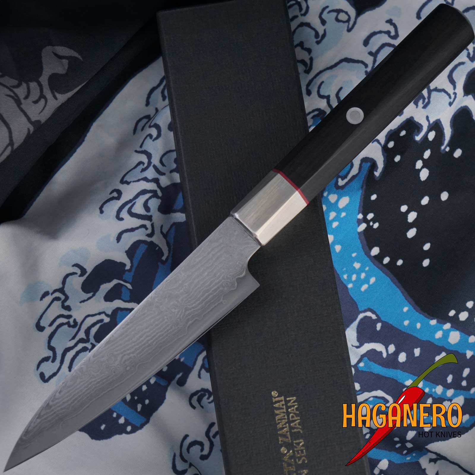 MCUSTA Zanmai Hybrid Splash, ein japanisches Gemüsemesser mit einer 11 cm langen Klinge. Die Klinge ist mit matten Damaststahlauskleidungen versehen. Der Kern hat einen Spiegelglanz und besteht aus VG-10 Stahl. Der Griff dieses Messers ist ein achteckiges Stück stabilisiertes Ebenholz (Pakkawood). Für die Herstellung des Polsters wird Neusilber verwendet. Elegante Zierelemente wie ein purpurroter Ring und eine Mosaiknadel zieren den Griff. Das MCUSTA Zanmai Hybrid Splash Petty HZ2-3001DS Messer wiegt 70 Gramm. Verwenden Sie den Geschirrspüler nicht zum Waschen. Waschen Sie Ihre Hände und tupfen Sie sie sofort trocken. ist in einer Markenbox verpackt.