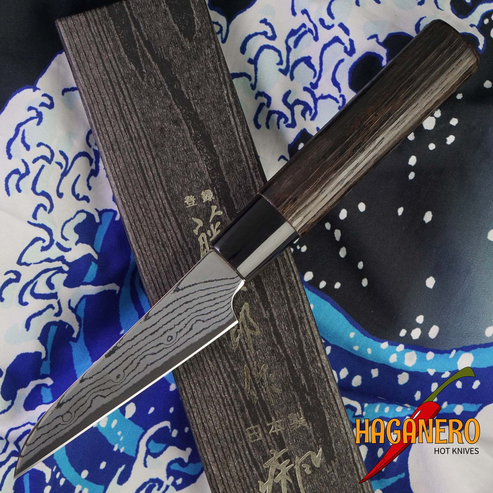 Schälgemüse Japanisches Küchenmesser Tojiro Shippu Black FD-1591 mit 9 cm Klinge. Die Shippu Black-Serie von Tojiro verfügt über einen VG-10-Kern und 63 Lagen Damaststahl im Klingendesign. Um die exquisite Musterung hervorzuheben, sind die Klingen schwarz eloxiert. Der Griff aus Kastanienholz ist sowohl elegant als auch nützlich.