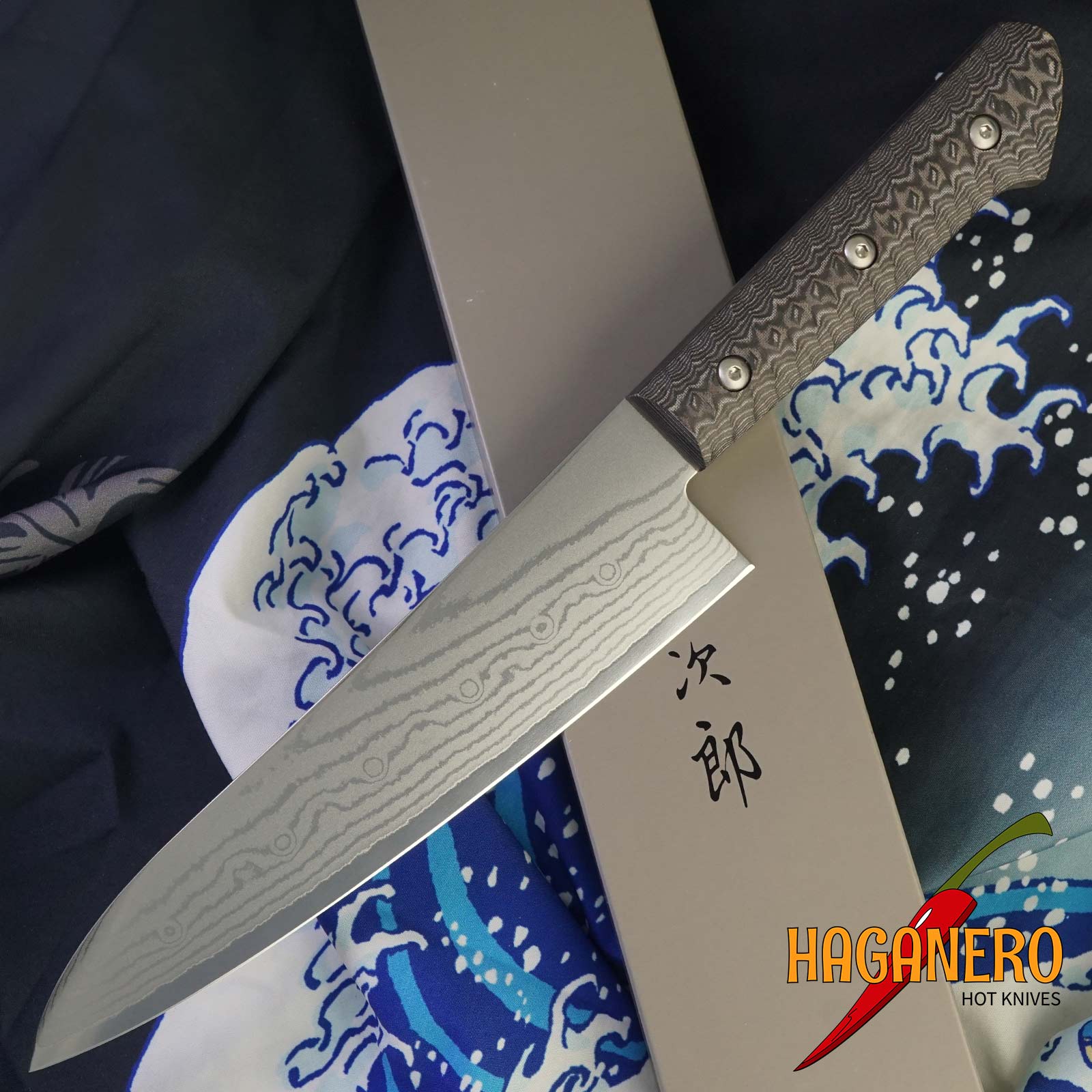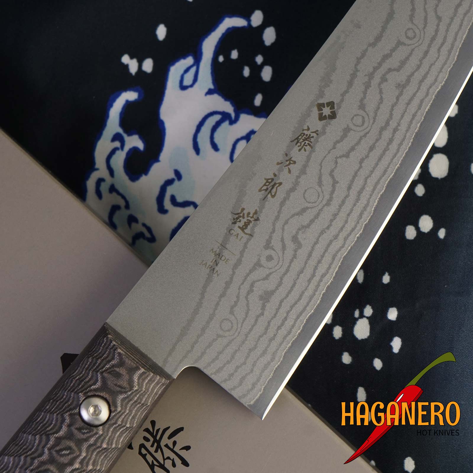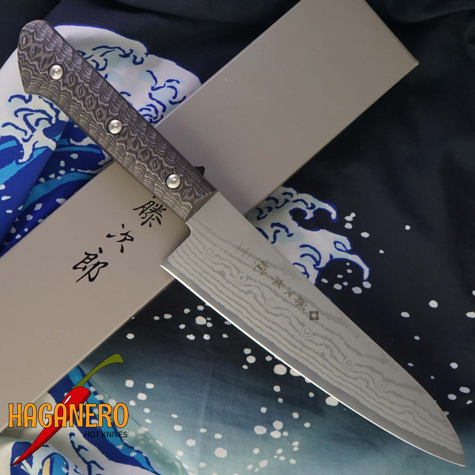 Tojiro Gai Messer mit einer 180 mm Klinge, Gyuto. Für die neue Tojiro GAI-Serie sind sowohl gewerbliche als auch private Anwendungen geeignet. Es ist nicht nur nützlich, sondern verfügt auch über ein hochwertiges und originelles Design. Der Kern besteht aus 37 Lagen Edelstahl mit niedrigem und hohem Kohlenstoffgehalt und ist aus feinstem japanischen Messerstahl VG-10 gefertigt. Sechskantschrauben halten die charakteristisch strukturierte, raue Oberfläche des Griffs an Ort und Stelle. Es ist unverwechselbar. Der Serienname „GAI“ wurde aus dem Griff und dem japanischen Wort „Armor“ abgeleitet.