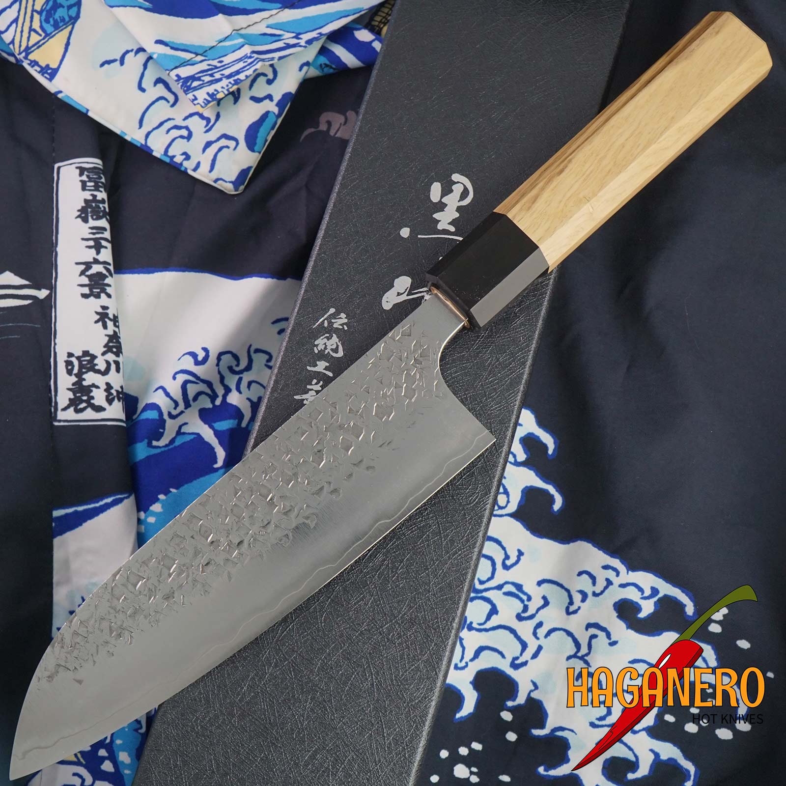 Yu Kurosaki Santokumesser mit 165 mm Klinge. In dieser Yu Kurosaki-Serie sind Klingen mit R2-Tsuchime-Finish enthalten. Dieses handgefertigte R2-Santoku weist Kurosakis Markenzeichen „Shizuku“ Tsuchime-Designs auf, die sowohl optisch schön als auch praktisch sind. Es hat ein erstaunliches Maß an Politur und Finish. Für die Herstellung des Achteckgriffs wird Eiche-Holz verwendet. Nach Gebrauch sorgfältig aufbewahren, nach dem Waschen und Trocknen mit einem sanften Schwamm aufbewahren. Vermeiden Sie es, in gefrorene Lebensmittel, harte Fruchtkerne oder Knochen zu schneiden. Zu den Vorschlägen für eine Schneidoberfläche gehören Holz, gummierte Platten, hochwertige Verbundwerkstoffe und hochwertige Kunststoffe wie Polyethylen. Diese Materialien tragen alle dazu bei, die Schneide eines Messers zu bewahren und zu schützen. Vermeiden Sie Arbeitsplatten, Metall, Glas und andere harte, unnachgiebige Oberflächen. Im Takefu Knife Village arbeitete Yu Kurosaki.