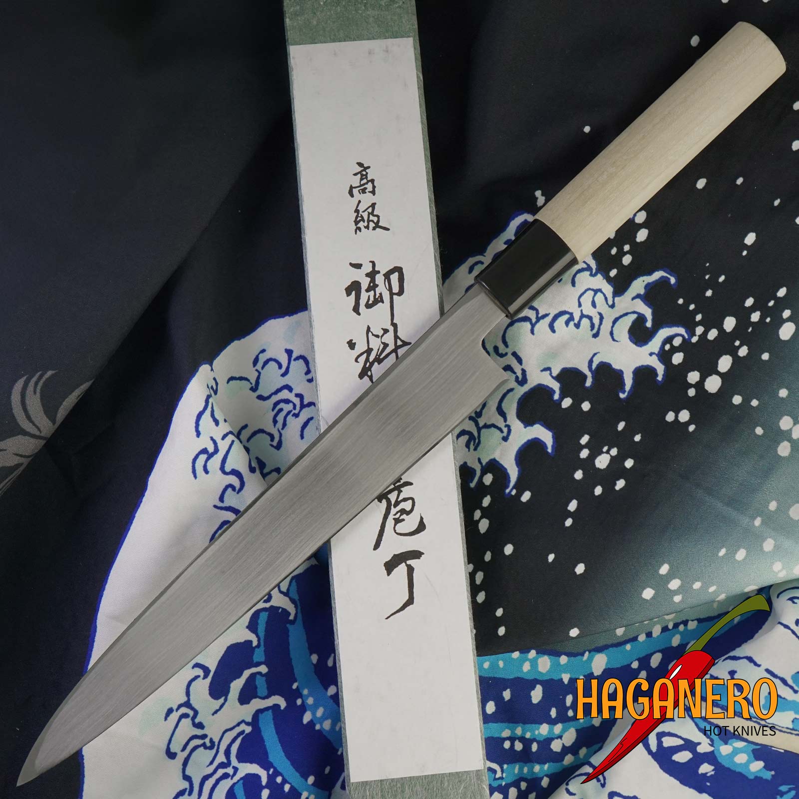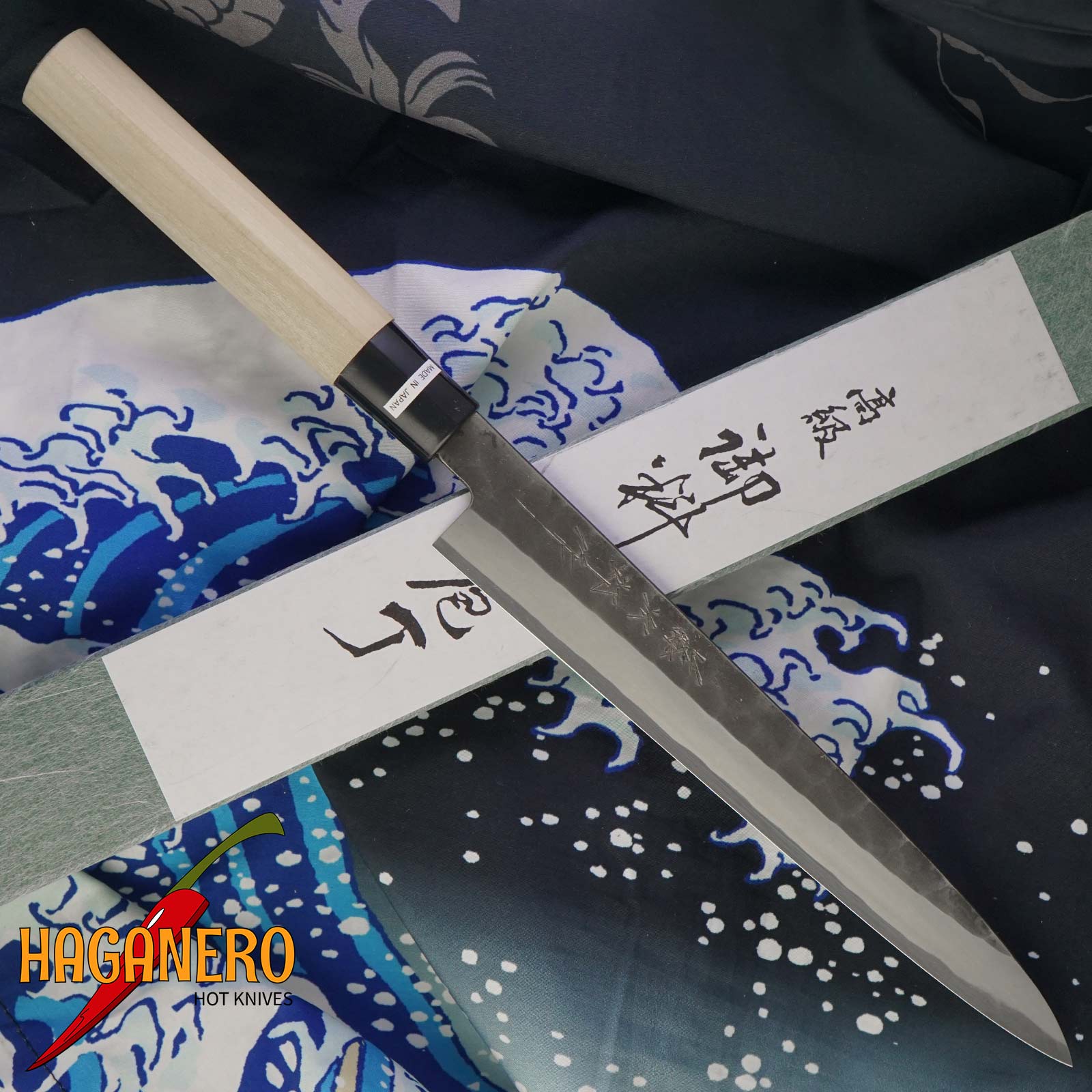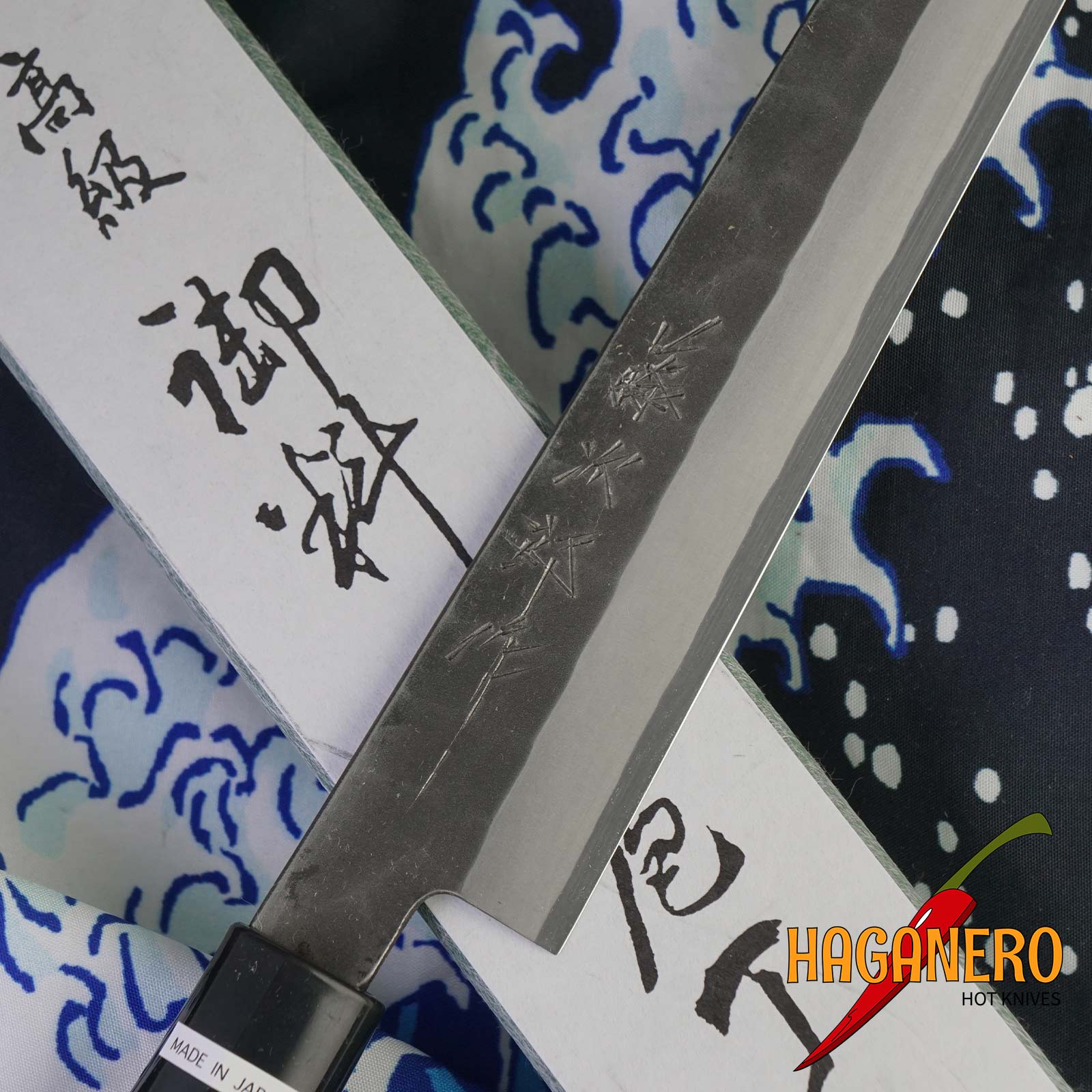 Yanagiba 21cm, Tojiro Hammered Black F-1080. Terä valmistettu Hiiliterästä käsin. Ole varovainen käyttäessäsi hiiliveitsiäsi. Tällaisia ​​veitsiä ei saa pestä astianpesukoneessa, jättää veteen, puhdistaa happamilla aineilla tai käyttää happamien hedelmien, kuten sitruunoiden, pilkkomiseen. Kuivaa veitsi käsin: Tee tämä heti, kun olet puhdistanut sen raikkaalla tiskipyyhkeellä. Levitä mineraaliöljyä ja hiero. Hiero ohut kerros mineraaliöljyä ruosteisille alueille ja anna kuivua.