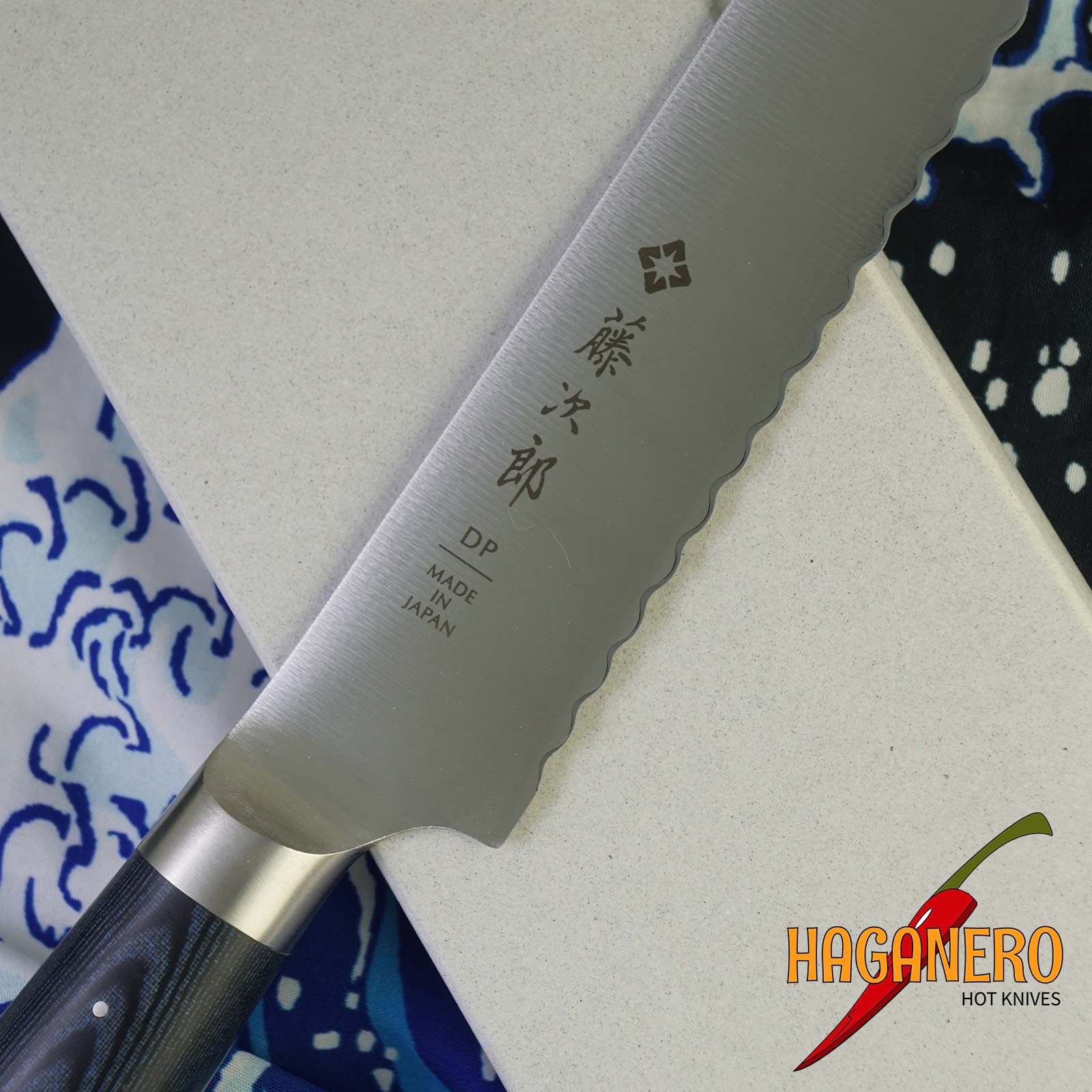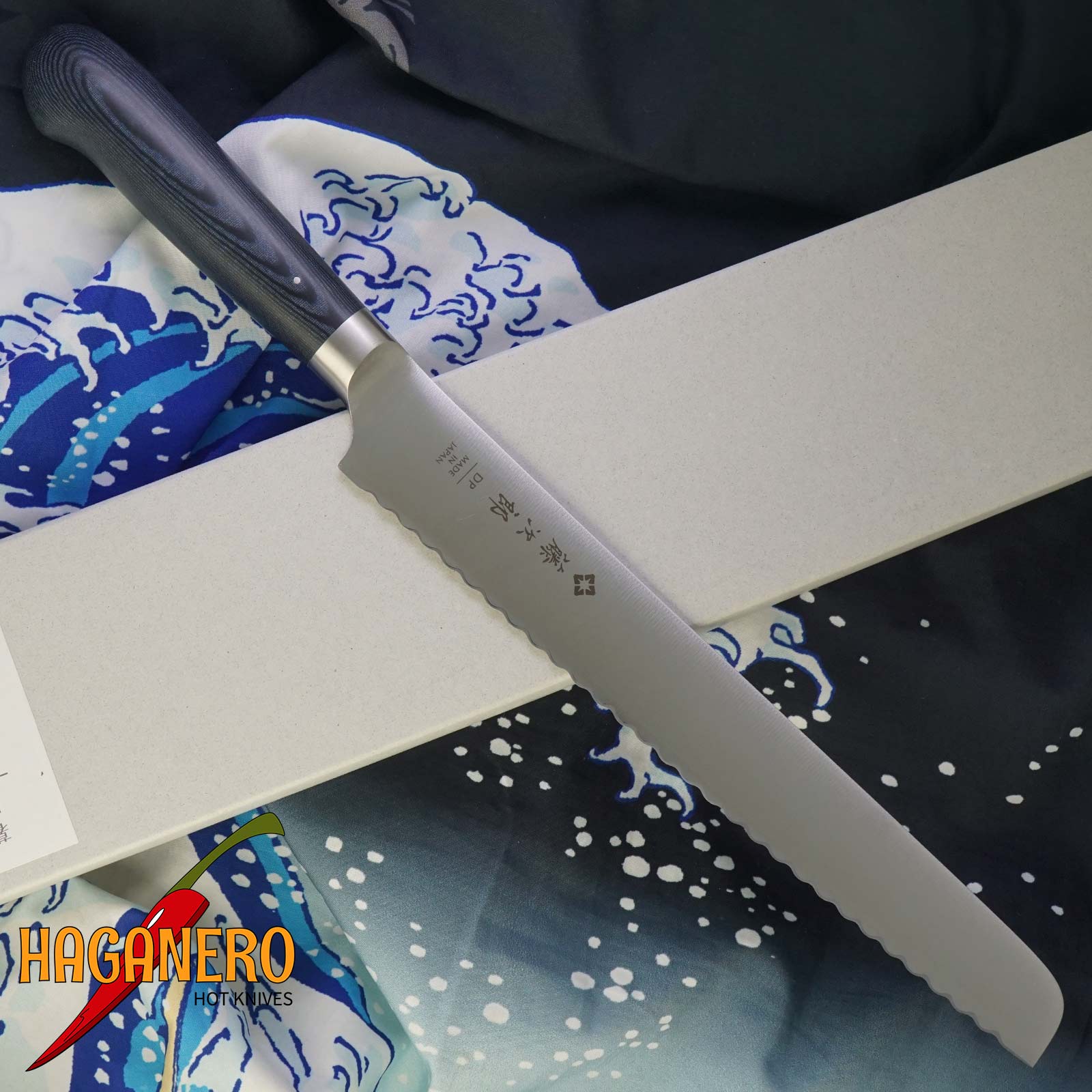 Coltello da pane Tojiro Home F-1304 con lama da 22 cm. Per soddisfare le esigenze della vita moderna in termini di qualità e design, è stata sviluppata la nuova serie Tojiro Home. Il coltello da pane F-1304 di Tojiro Home ha un manico in micarta blu/nero. È intagliato a mano, lucidato e si adatta perfettamente alla mano. Per garantire sia un'affilatura professionale che una facile manutenzione per gli utenti domestici, il nucleo della lama in VG10 è rivestito in acciaio inossidabile al cromo 13 antiruggine su entrambi i lati. I bordi convessi sono facili da riaffilare e offrono un buon mix di affilatura e durata.