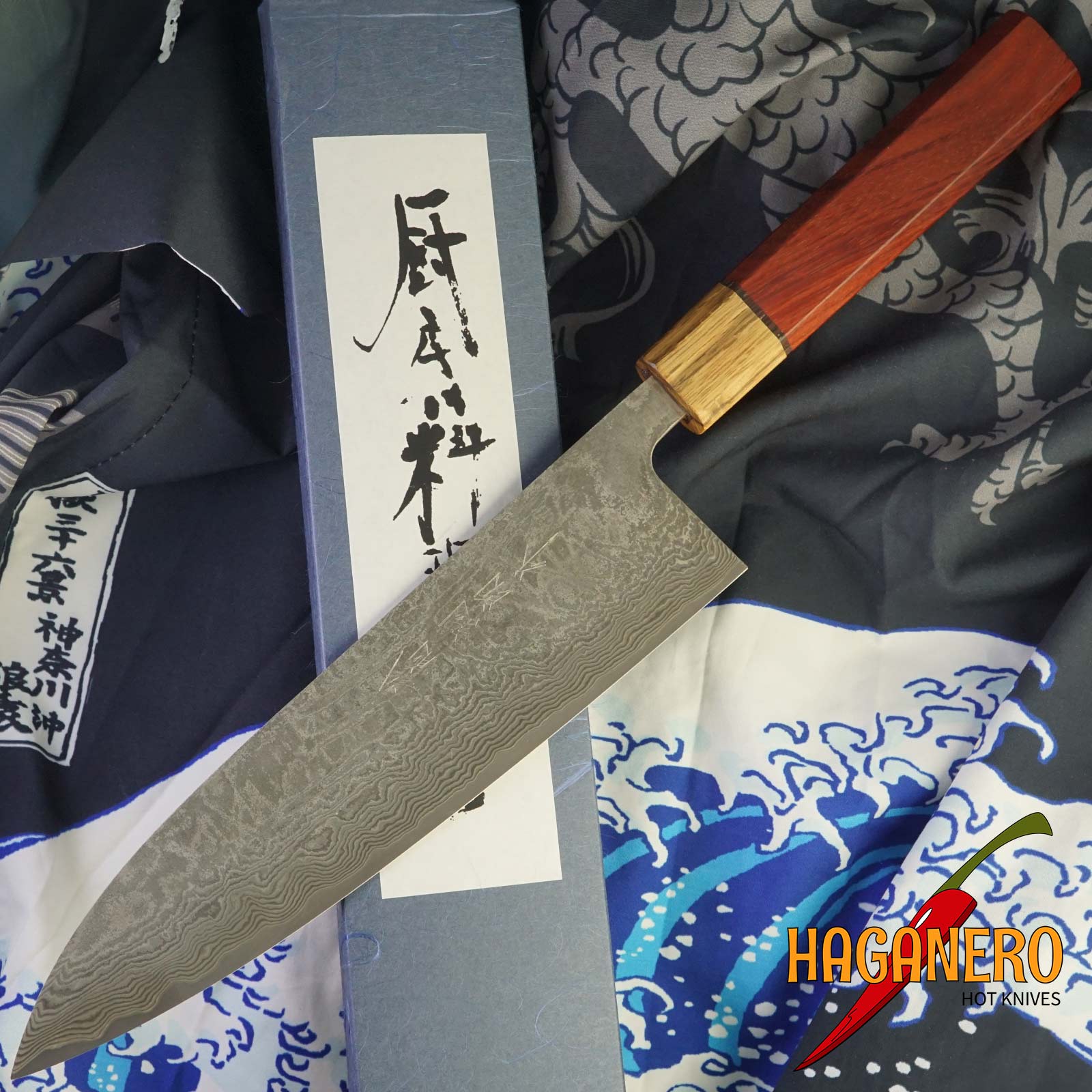 Il maestro Shiro Kamo ha fatto a mano un coltello da chef giapponese.  La lama è lunga 210 mm.  Maniglia Rengas con ghiera in rovere.  L'acciaio Damasco SG2 viene utilizzato per realizzare la lama del coltello da chef Shiro Kamo.  L'acciaio in polvere SG2 è un acciaio inossidabile ad alta lega con un alto contenuto di carbonio.  Non è consentito utilizzare una lavastoviglie per pulire questo coltello da cuoco giapponese.  Il coltello del signor Shiro Kano ha una lama stretta ed estremamente resistente.  Ossa, carne con ossa, noci di cocco e altre noci e altri oggetti duri non possono essere tagliati con coltelli da cucina giapponesi.  Nato nel 1958, Shiro Kamo ha ricevuto il rinomato titolo giapponese di "Dento-Kogei-shi" (Maestro dell'artigianato tradizionale) all'età di 45 anni in riconoscimento della sua esperienza.  Attualmente è presidente della Takefu Knife Village Association.