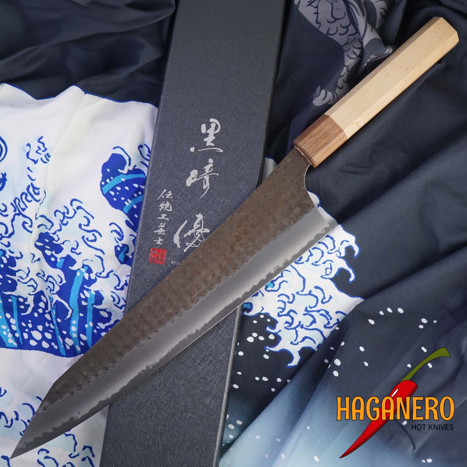 Il coltello da cucina giapponese Gyuto di Yu Kurosaki della serie Koku Sen. Il materiale della lama è Aogami Super Steel. La lama ha una durezza di 60-62 HRC e una lunghezza di 27 cm. Il legno di mela cotogna è usato per fare la maniglia. Yu Kurosaki, un grande artigiano, fa il coltello a mano.