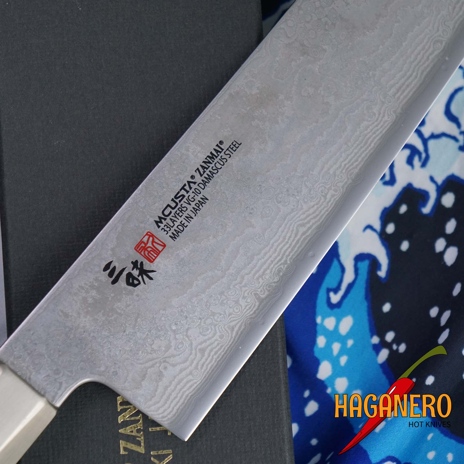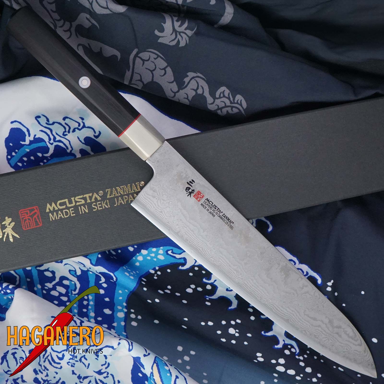 The MCUSTA Zanmai Hybrid Splash HZ2-3007DS Japanese chef's knife has a 24-cm blade. Both expert and novice chefs can use this kitchen knife for any work. For both men and women, the MCUSTA Zanmai Hybrid Splash knife is a lovely and practical present. The blade's inside is made of matte-finished Damascus steel. The core has a mirror shine and is composed of VG-10 steel. This enhances the blade's visual appeal. This Japanese chef's knife has an octagonal stabilised ebony (pakkawood) handle. Nickel silver is used to make the handle. The handle features a sophisticated red ring and a mosaic pin. Avoid using the dishwasher for washing.