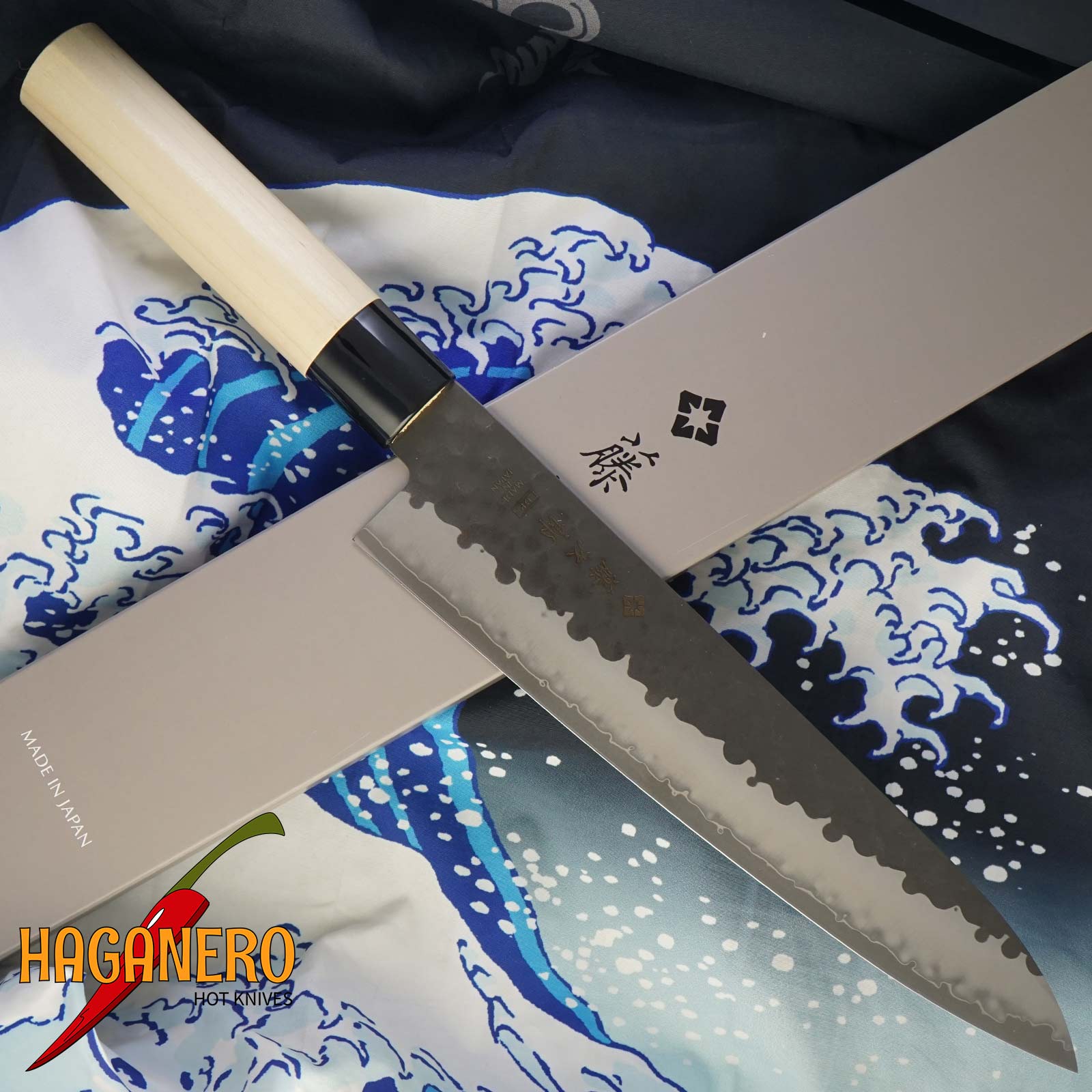 24 cm Tojiro VG10 Hammered Chef knife. The blade is made of VG10 with a soft stainless steel san mai sandwich. This well-made and low-maintenance knife is completed with a straightforward white wood handle featuring a D-shaped form. The Tojiro VG10 Hammered Chef knife has a weight of 275 grams.