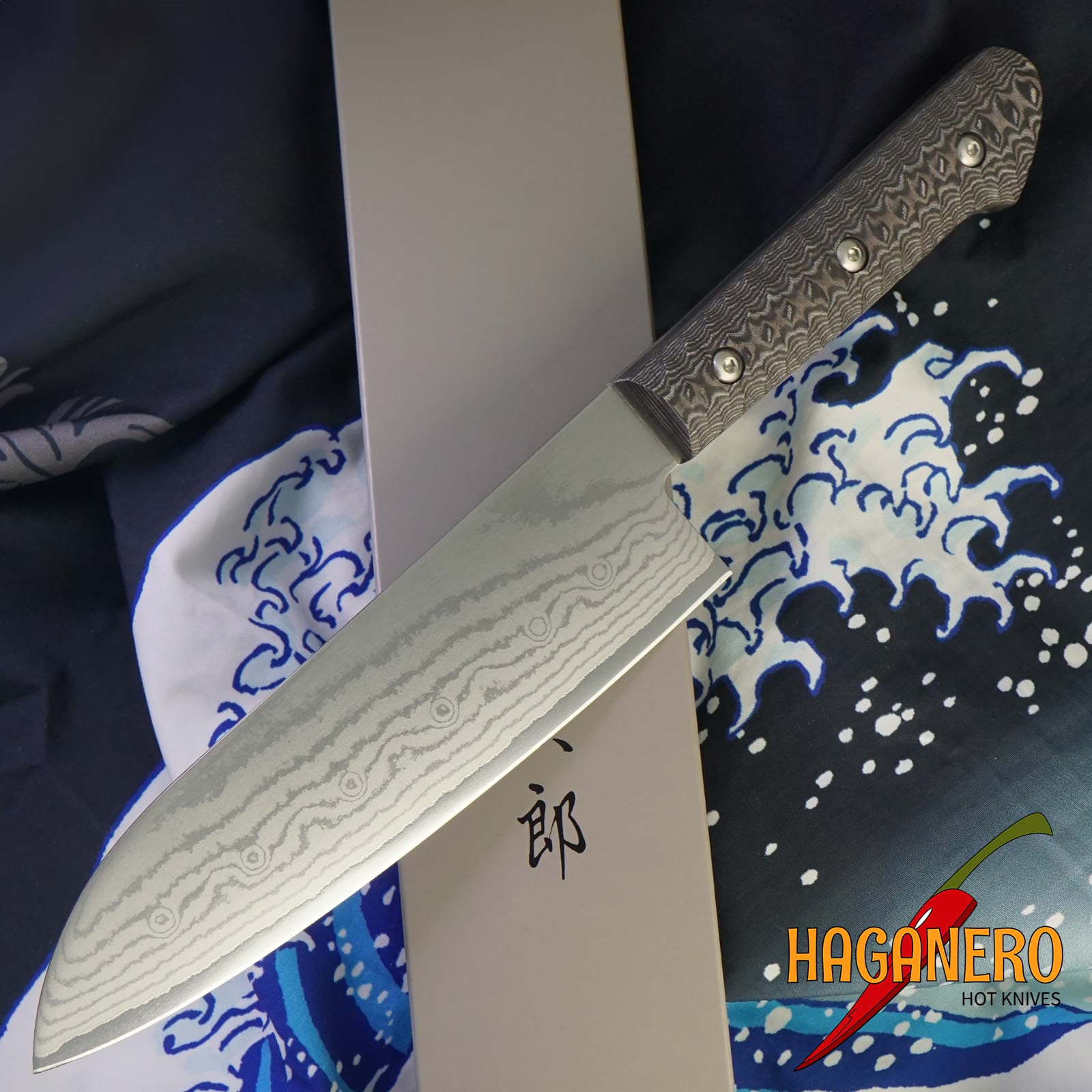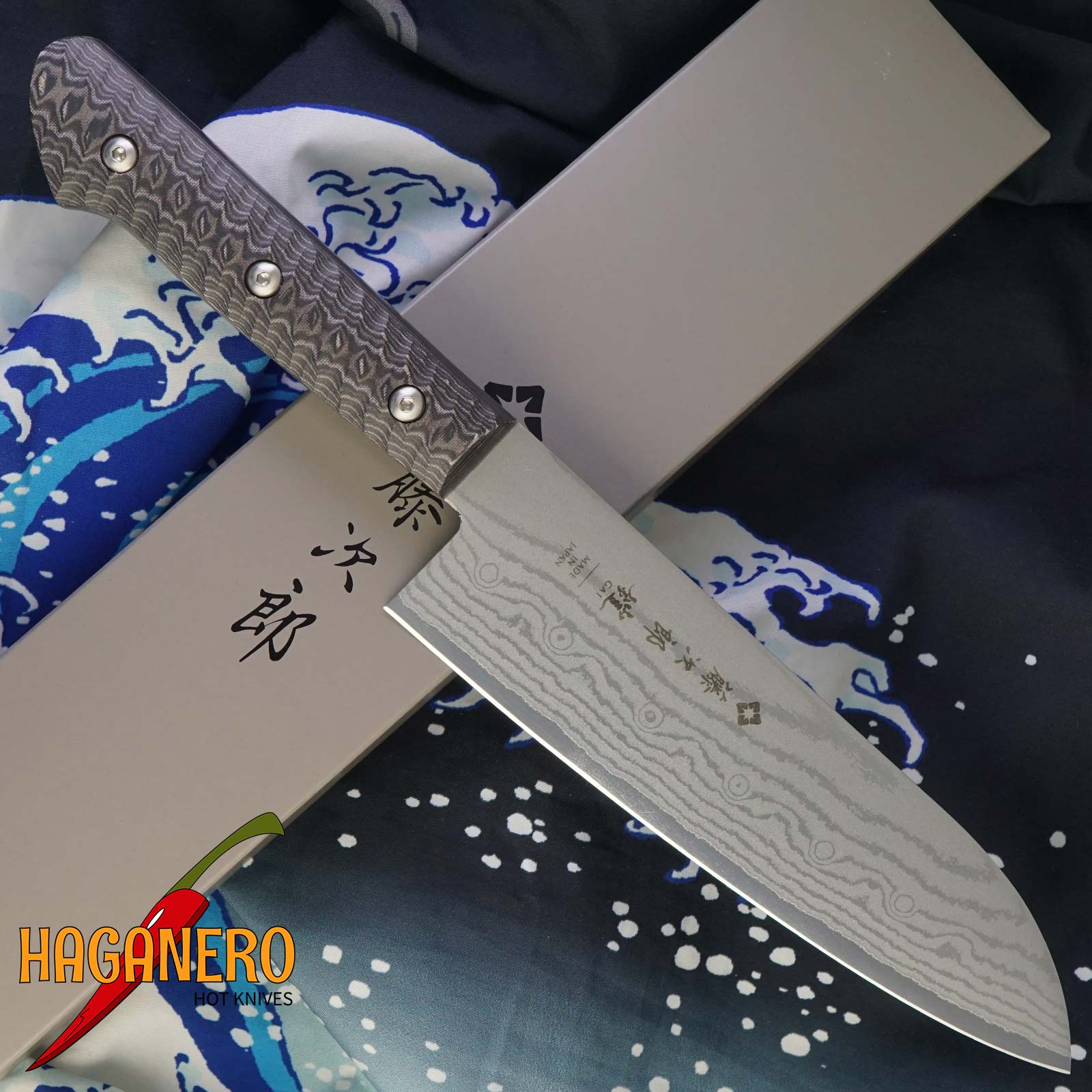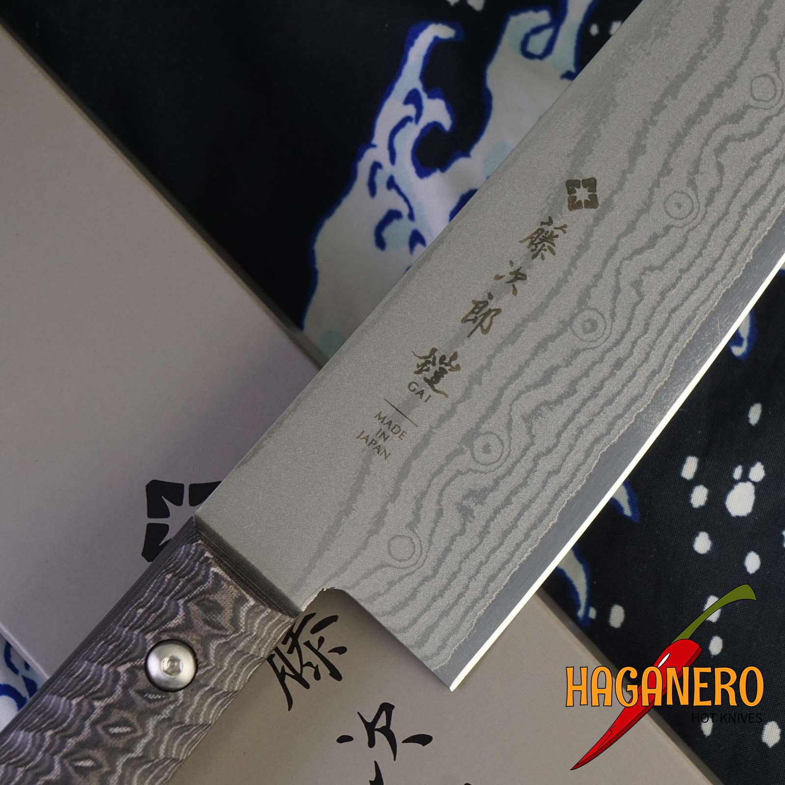 Tojiro Gai Knife with a 170 mm blade, santoku. Both commercial and residential applications are appropriate for the new Tojiro GAI series. In addition to being useful, it has a superior and original design. The core is made of 37 layers of low and high carbon stainless steel and is made of the finest Japanese knife steel VG-10. Hex bolts hold the handle's distinctively textured, rough surface in place. It is distinctive. The series name "GAI" was derived from the handle and the Japanese word "armor".
