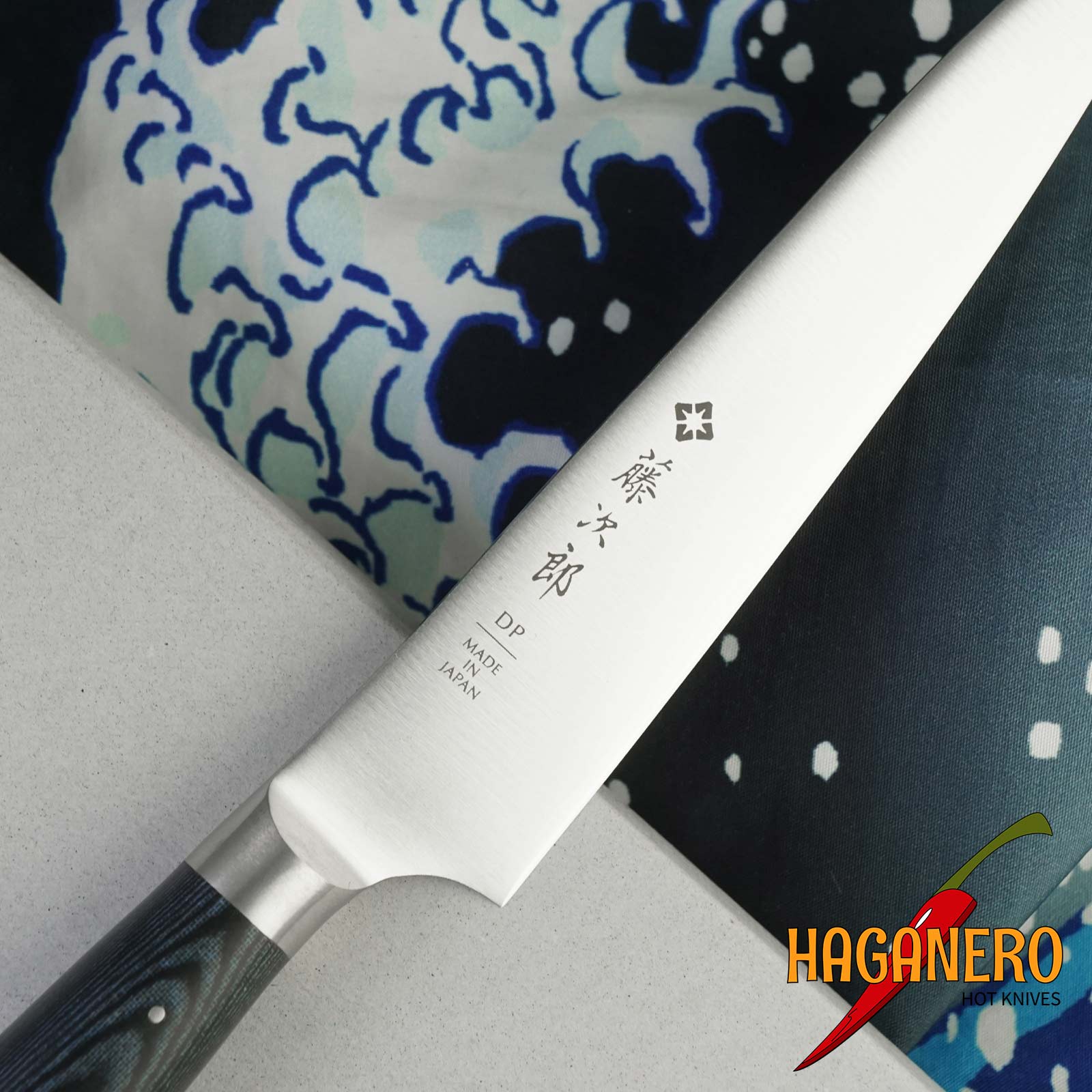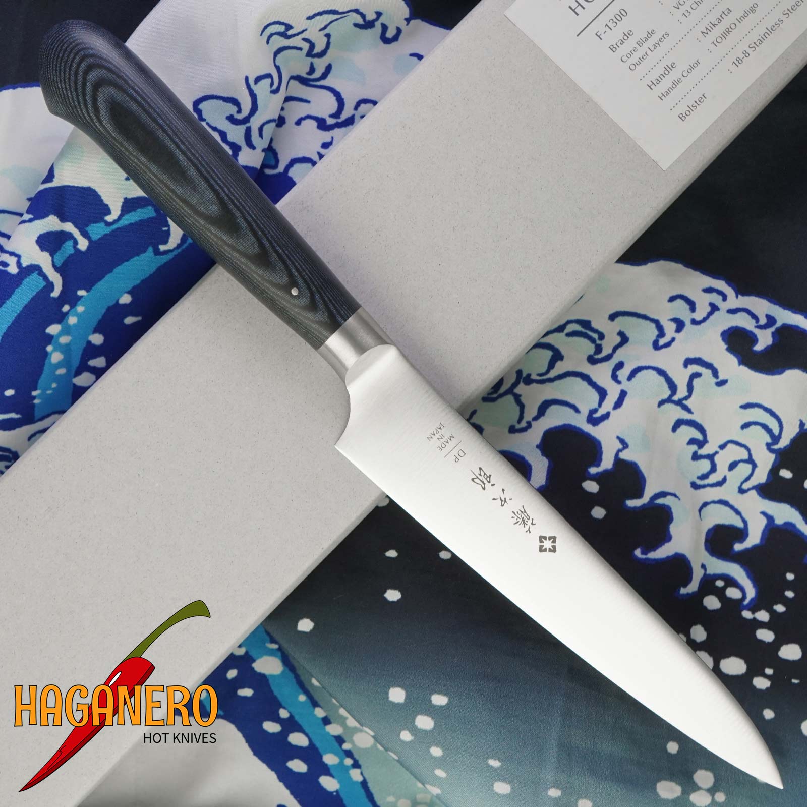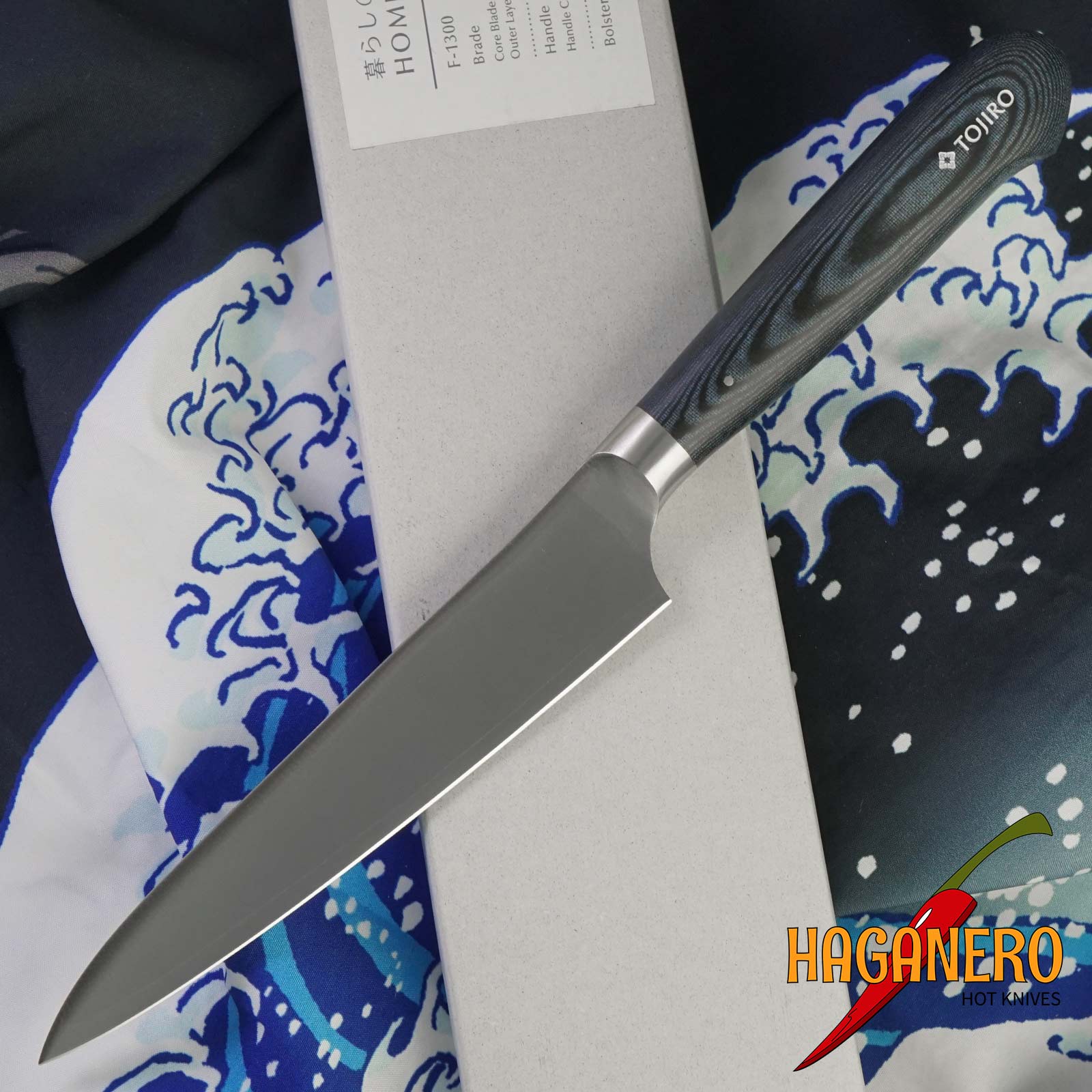 13.5 cm blade Tojiro Home Petty Knife F-1300. To meet the needs of modern life in terms of quality and design, the new Tojiro Home series was developed. The knife has a blue/black micarta handle. It is hand carved, polished, and fits your hand perfectly. In order to establish both professional sharpness and simple maintenance for home users, VG10 as the core blade is covered by anti-rust 13 chrome stainless steel on both sides. Convex ground edges are easy to resharpen and have a nice blend of sharpness and durability.