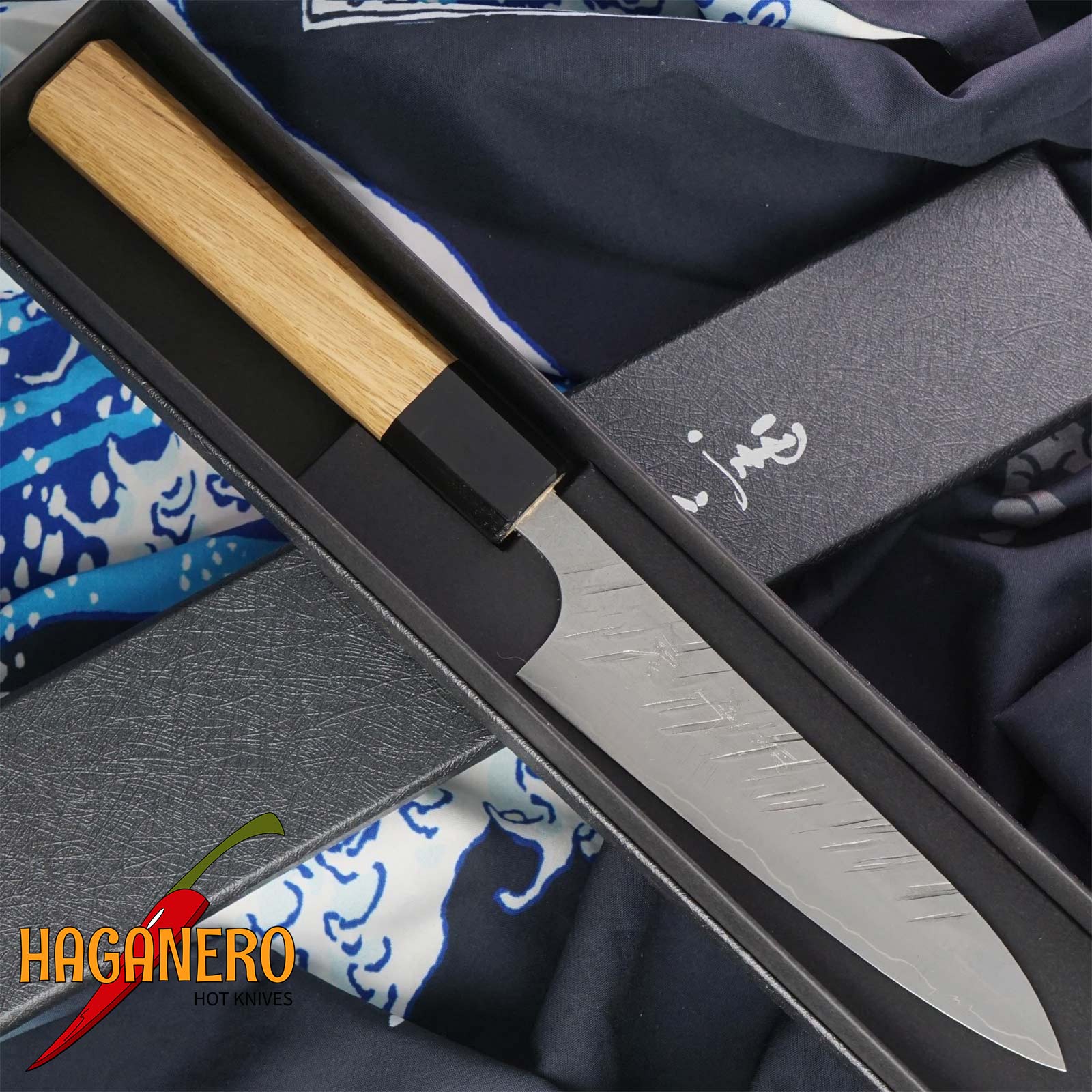 Yu Kurosaki created the exquisite little multipurpose Japanese kitchen knife known as the Fujin R2 Petty by hand. The blade is composed of three layers of R2 steel and has a distinctive Tsuchime hammered pattern. As shown in the forged pattern, Kurosaki drew inspiration for this series from Fujin, the Shinto god of the wind. Oak is used to make the octagonal handle.