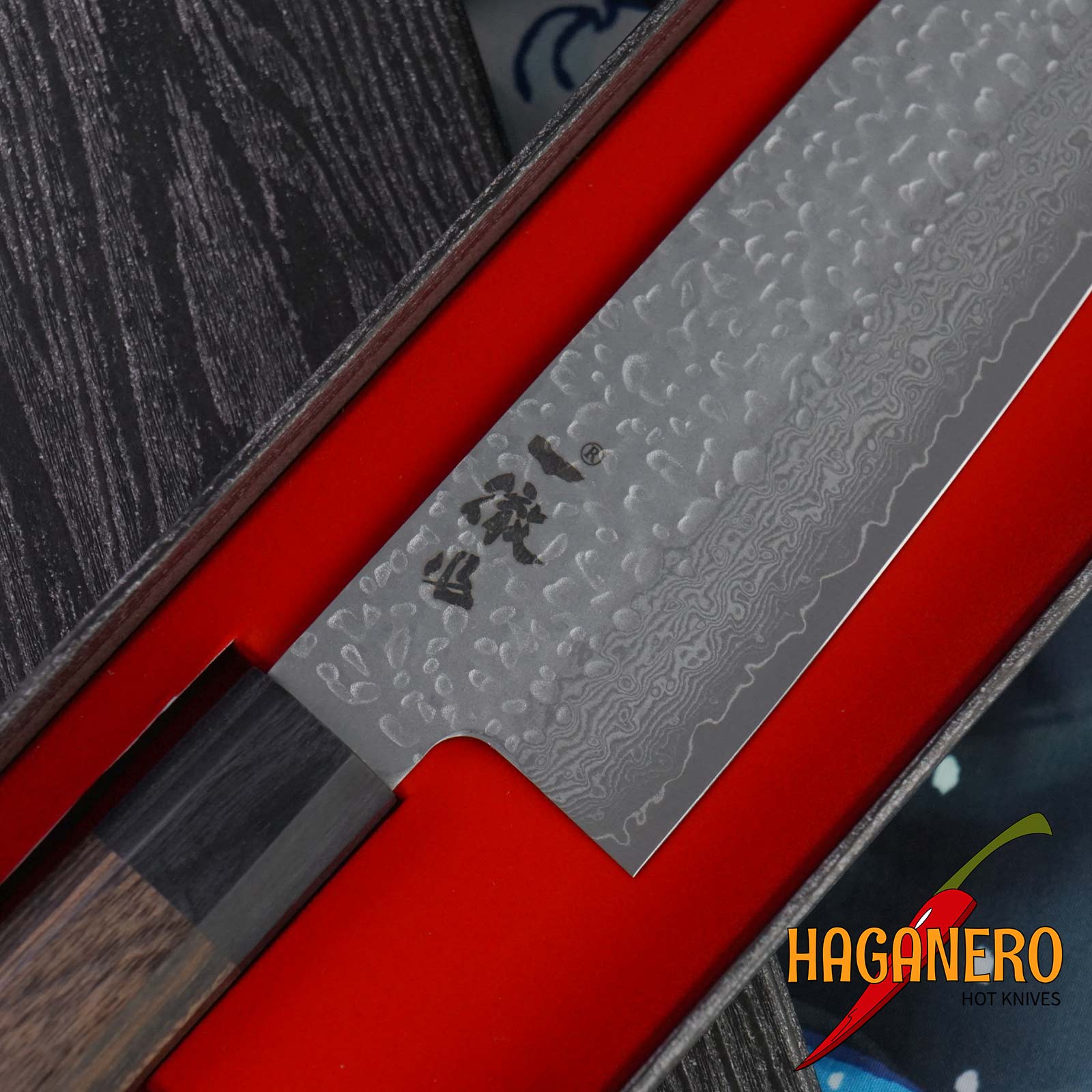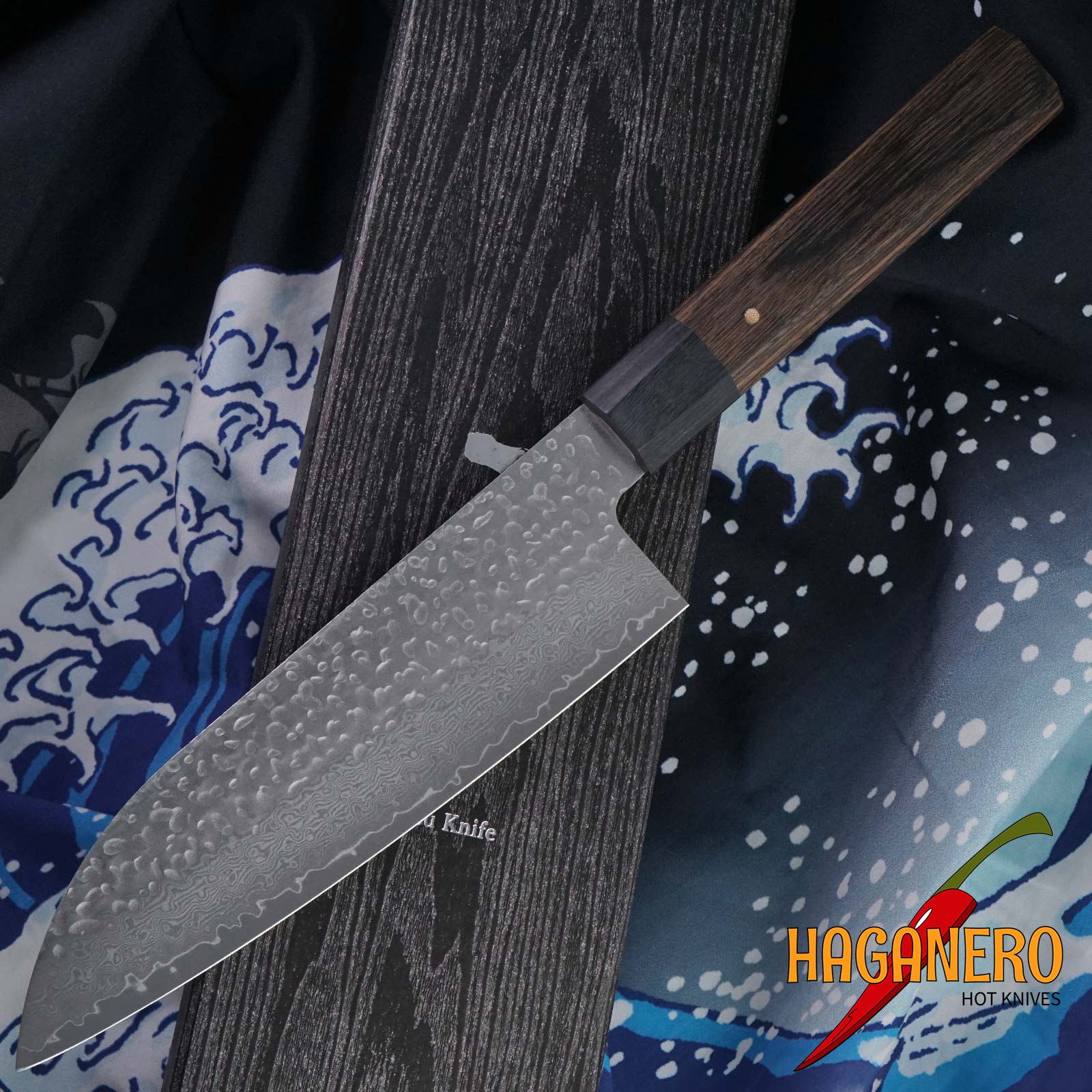 The majority of foods can be sliced and shredded with the Japanese santoku kitchen knife. It is appropriate for lengthy culinary activities because to its small size and blade length of only 15 cm. The blade has a VG10 core and is made of exquisite multilayered Damascus steel. Stabilised pakka wood is used to make the handle. The weight of the Ittetsu IWZ-112 santoku is roughly 270 g. The knife is not dishwasher safe, despite the fact that pakka wood and VG10 steel are resistant to moisture and corrosion.