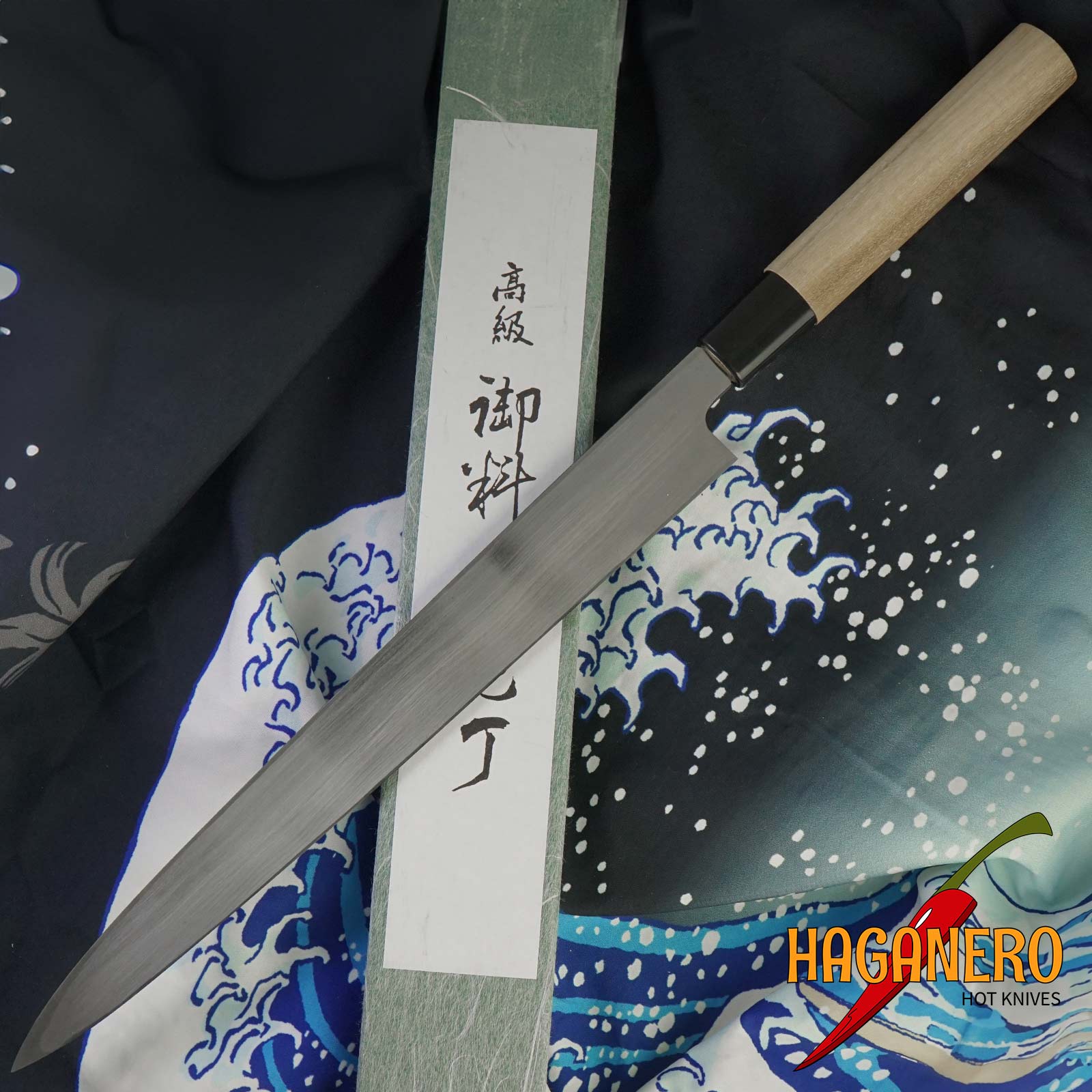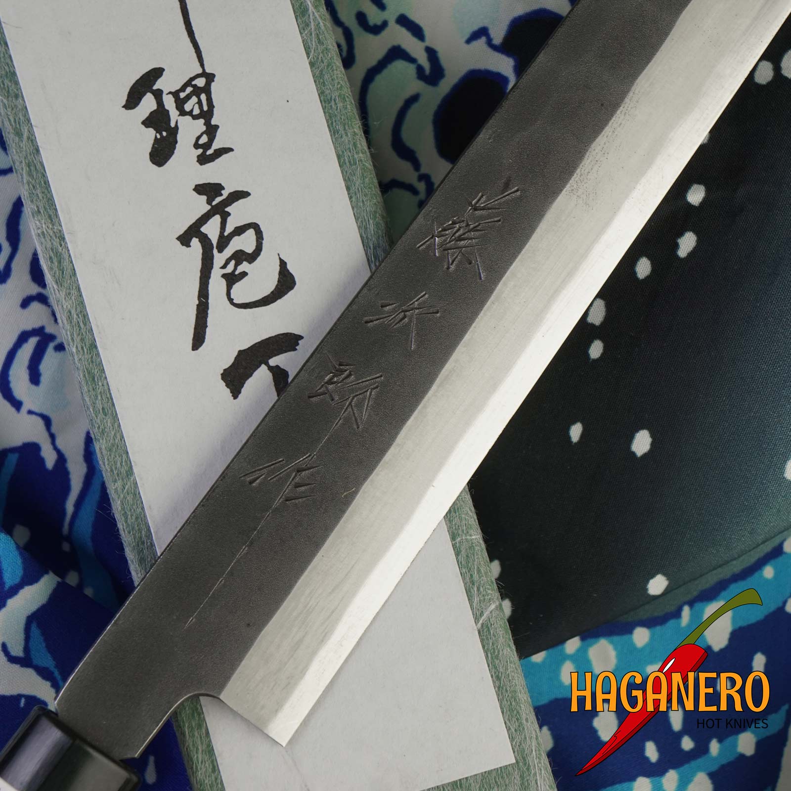 Yanagiba 27cm by Tojiro Hammered Black F-1082. Blade made of carbon by hand. Please be careful when using your carbon knives. Such knives should not be washed in a dishwasher, left in water, cleaned with acidic substances, or used to chop acidic fruits like lemons. Dry your knife by hand: You should do this right away after cleaning it with a fresh dishtowel. Apply mineral oil and rub. Rub a thin layer of mineral oil on any rusty areas and let it dry.